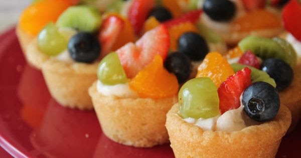 Fruit Cookie Cups - Ingredients: 1 Package Pillsbury Refrigerated Sugar Cookie Dough, 1 8oz package cream cheese, softened, 1/4 cup sugar, 1/2 tsp vanilla, assorted fruits chopped to equal size.