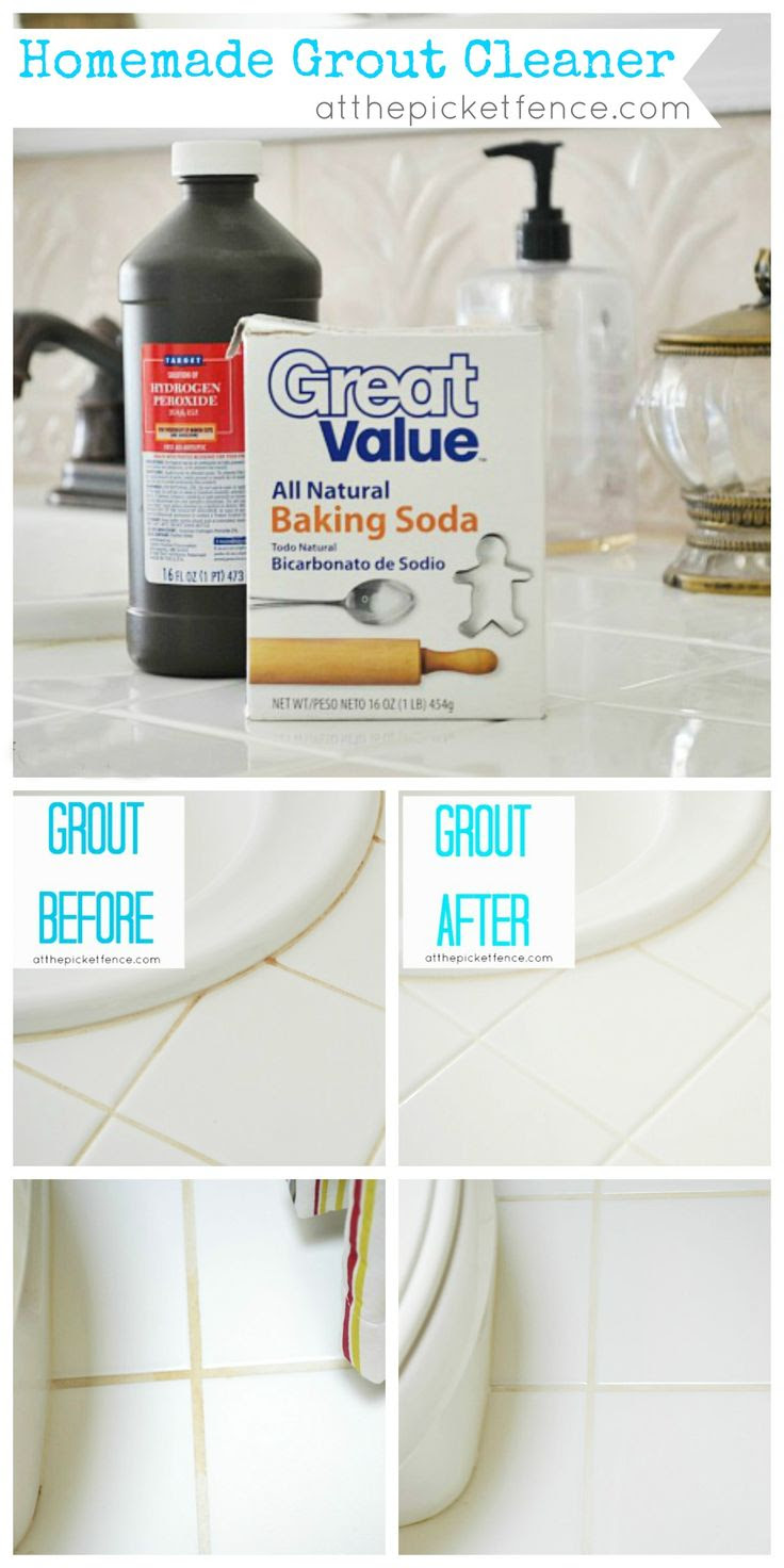 Homemade Grout Cleaner- Getting down on all fours to scrub out your tub while breathing in toxic fumes is not fun. As one can imagine, inhaling these chemicals is not good for your lungs. Make your own homemade grout cleaner mixing up a ratio of 1/2 cup of baking soda, 1/4 cup hydrogen peroxide, and 1 teaspoon of liquid dish soap. Shake it all up and watch your grout lines restore to their original condition.
